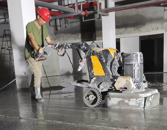使用专业打磨机对基面进行打磨,依地面情况选择干磨或水磨,先用50目树脂磨片打磨两遍,再用100树脂磨片打磨两遍,打磨完后清理表面浮浆、灰尘,打开原有地面的空隙,让混凝土密封固化剂可以充分渗透,坑洞修补及不平整处点补。